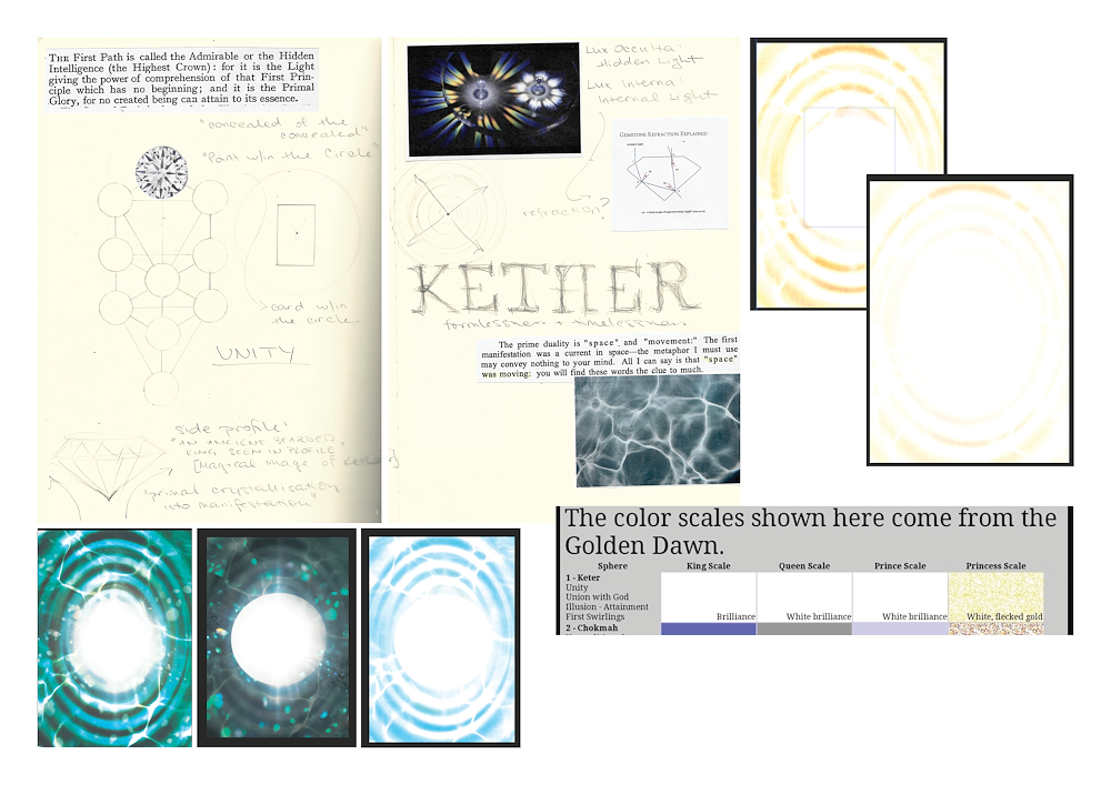 I was drawn to the earlier iterations (bottom left) but they felt far too “dynamic” and more aligned with the energy of Chokmah than the simple, elevated, ultimate presence of Kether. Color presented a particular challenge: according to the Golden Dawn color scheme, Kether is white. I considered an entirely white card, but this felt too static and lifeless. I needed to convey a certain kind of power but not let it slip into the dynamism of Chokmah. Luckily, the colour scheme in the lowest manifestation of Kether is white with flecked gold. I now had the permission, so to say, to add depth.